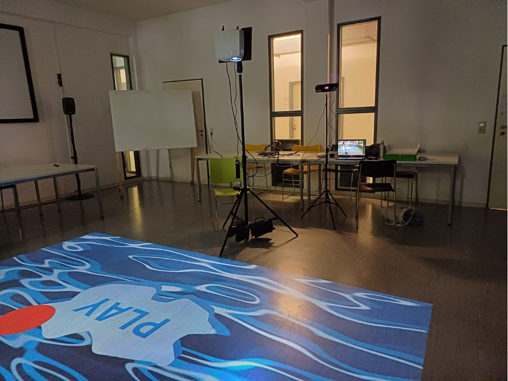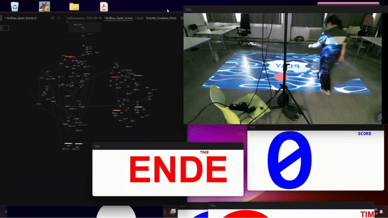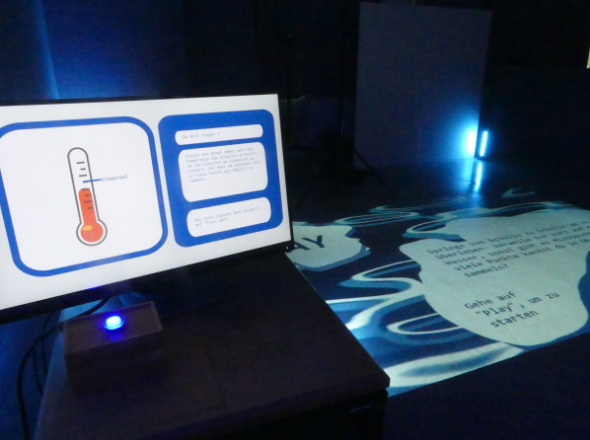 Minispiel mit Alternativem Interface In „Future Fragments“ schlüpfst du in die Rolle eines Eisbärs, der von Eisscholle zu Eisscholle springt. Im Einzelspielermodus musst du innerhalb einer Minute möglichst viele Schollen erreichen, während diese immer kleiner und schwerer zu erreichen werden. Der zweite Spieler nimmt die Rolle der Menschheit ein und kann dem Eisbären (Spieler 1) helfen, indem er in einem One-Button-Game, die angesetzten Klimaziele erreicht und somit das Schmelzen der Schollen verzögert. Material: vvvv, Pc, Projektor, Bildschrim, Kinect, Makey Makey, Arcade Button und ButtonBox Einzelprojekt: Programmierung, Konzept, Planung, Game Design, Asset Design