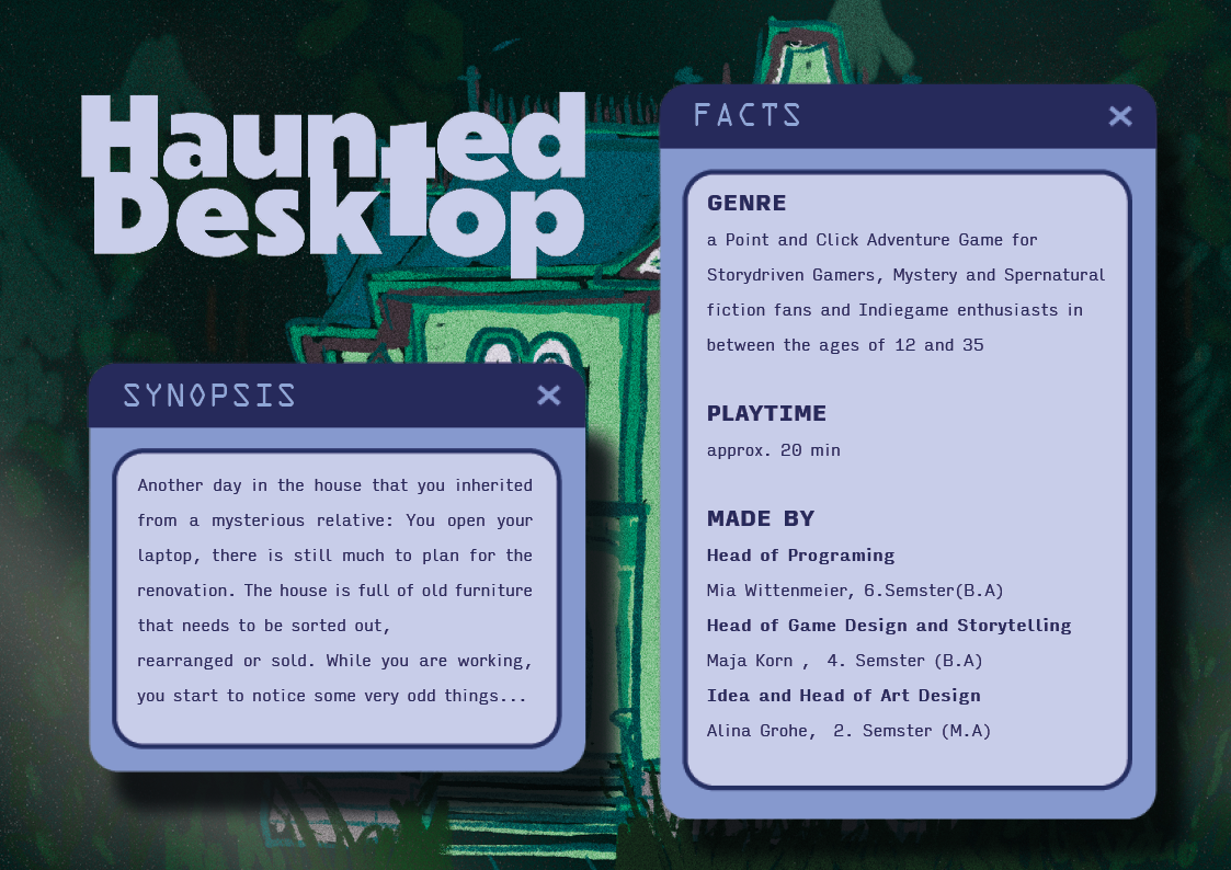 Point and Click Game In Haunted Desktop erbst du ein altes Haus – und einen ungebetenen Mitbewohner. Während du am PC deine Renovierung planst, beginnt das Haus, sich gegen dich zu wehren. Der Geist, der hier seit Jahrzehnten wohnt, will nicht, dass sich etwas verändert. Zwischen digitaler Planung und übernatürlichen Störungen verschwimmen die Grenzen zwischen Realität und Spuk. Wirst du den Geist vertreiben oder seinen Willen akzeptieren? Mein Beitrag: Idee, Game Art, Programming Assistance Engine: Unity