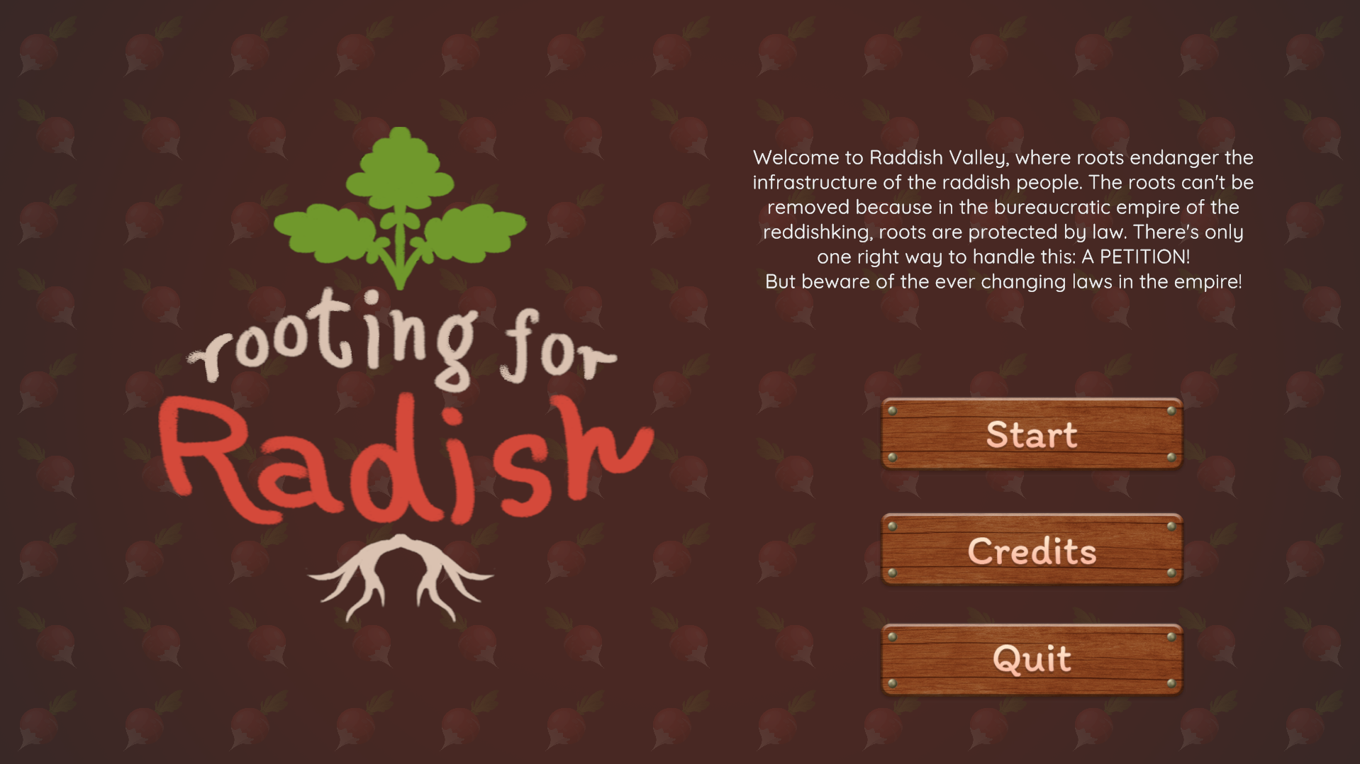 Ein Spiel das im Rahmen des Global Game Jams 2023 entstanden ist. Willkommen in Raddish Valley, einem Tal, in dem Wurzeln die Infrastruktur der Rübenbewohner bedrohen. Entfernen ist keine Option, denn im bürokratischen Reich des Rübenkönigs sind Wurzeln gesetzlich geschützt. Es gibt nur einen legalen Weg, das Problem zu lösen: eine Petition! Doch Vorsicht: Die Gesetze des Reiches ändern sich ständig, und jeder Schritt muss gut überlegt sein. Mein Beitrag: Programming, Game Design, Level Design Engine: Unity