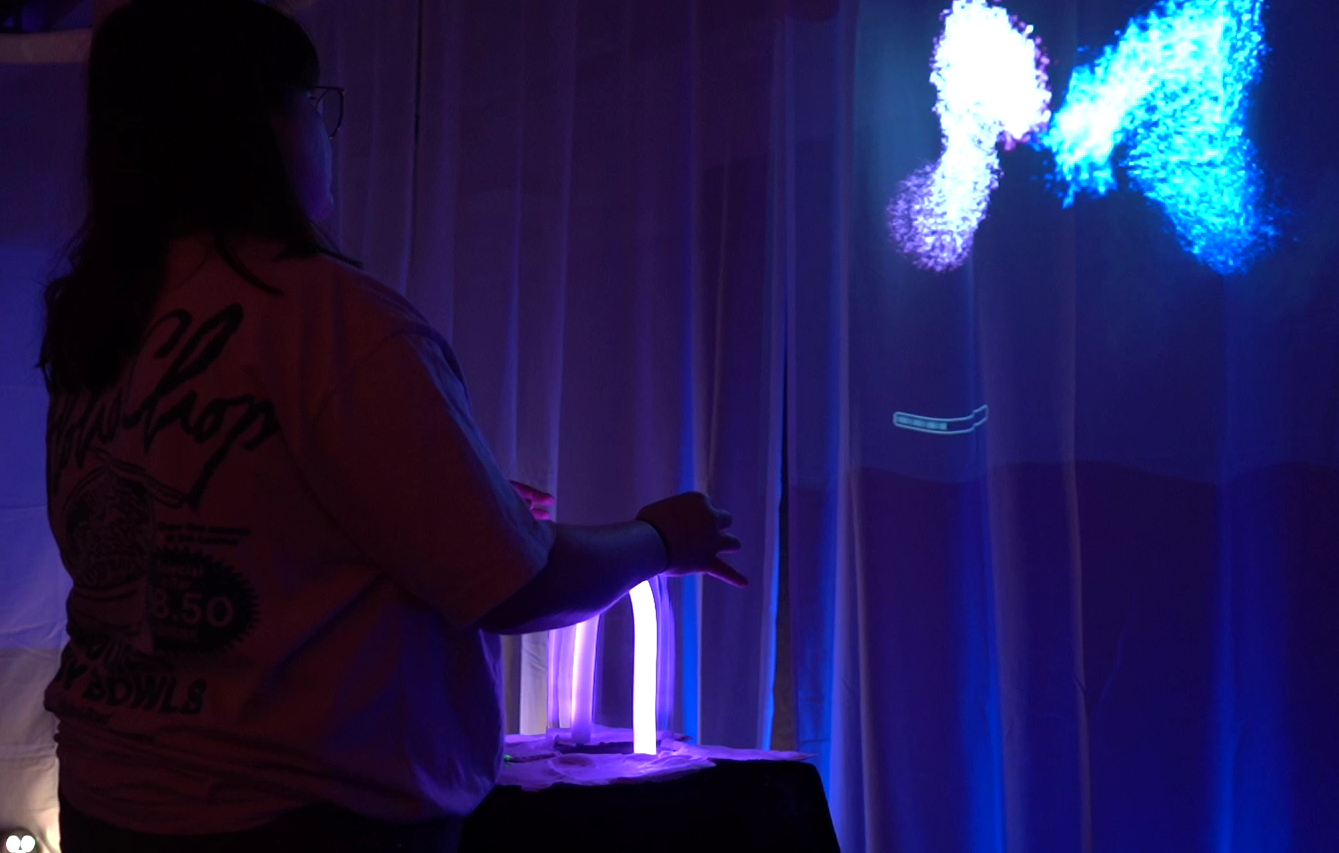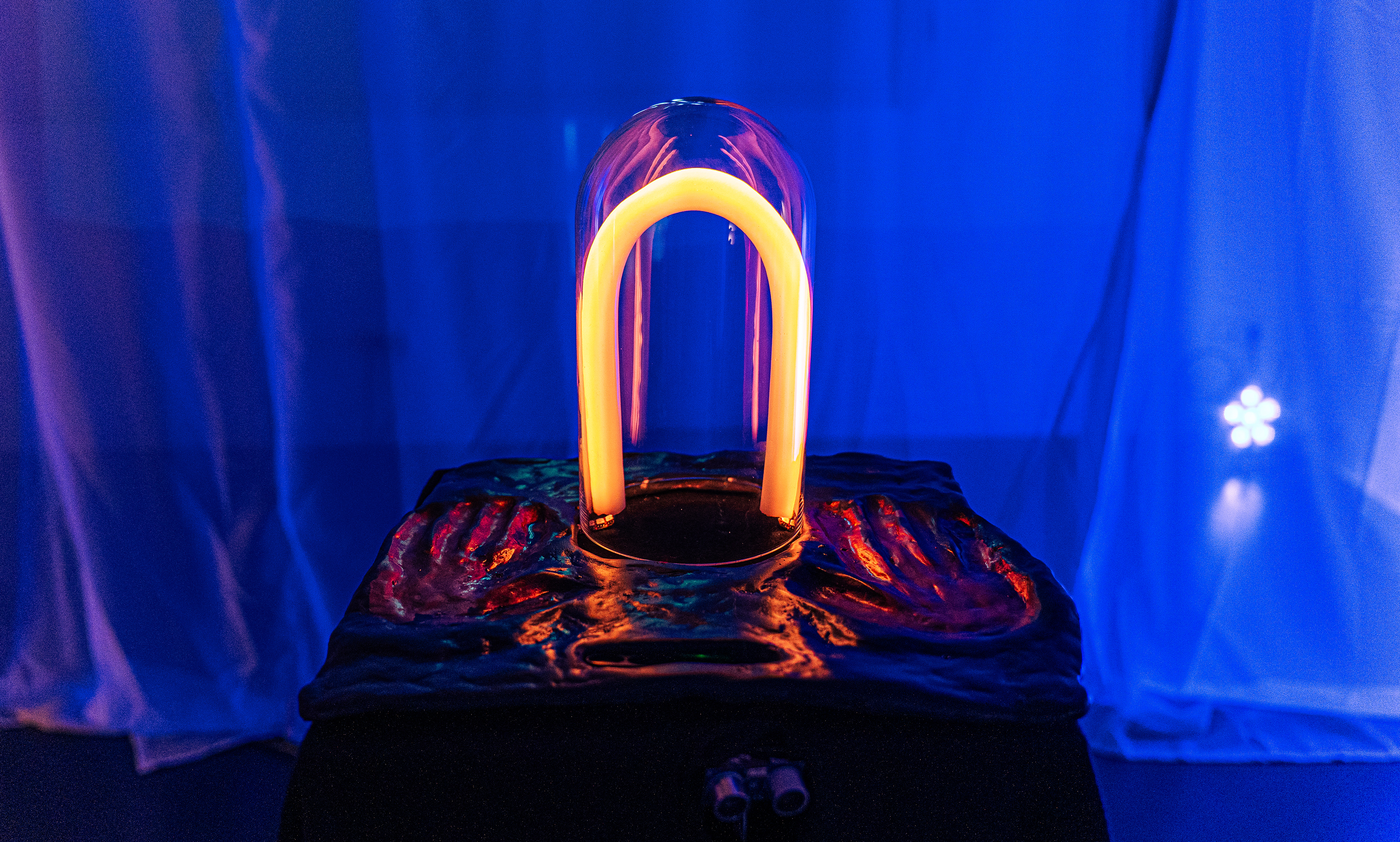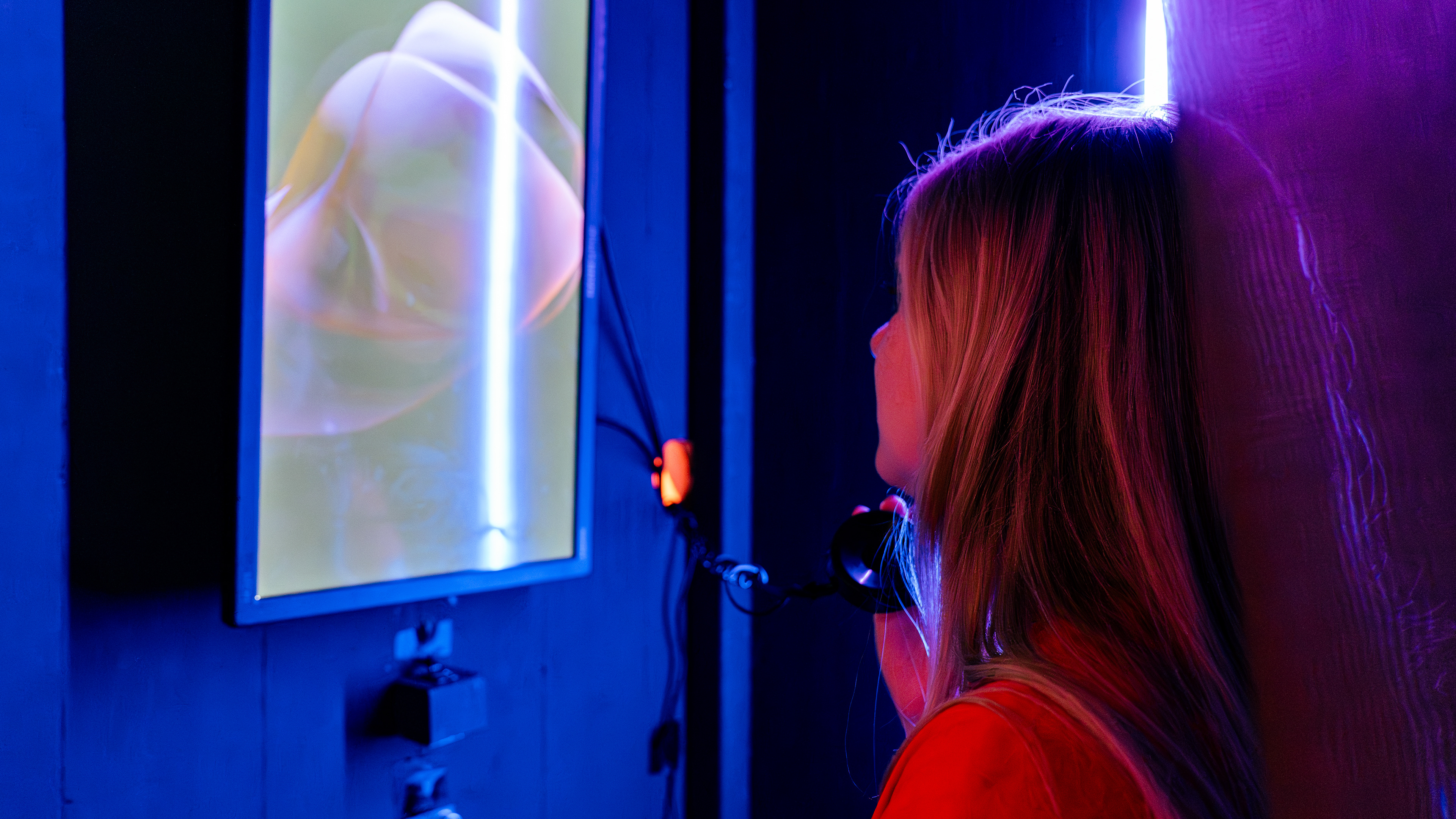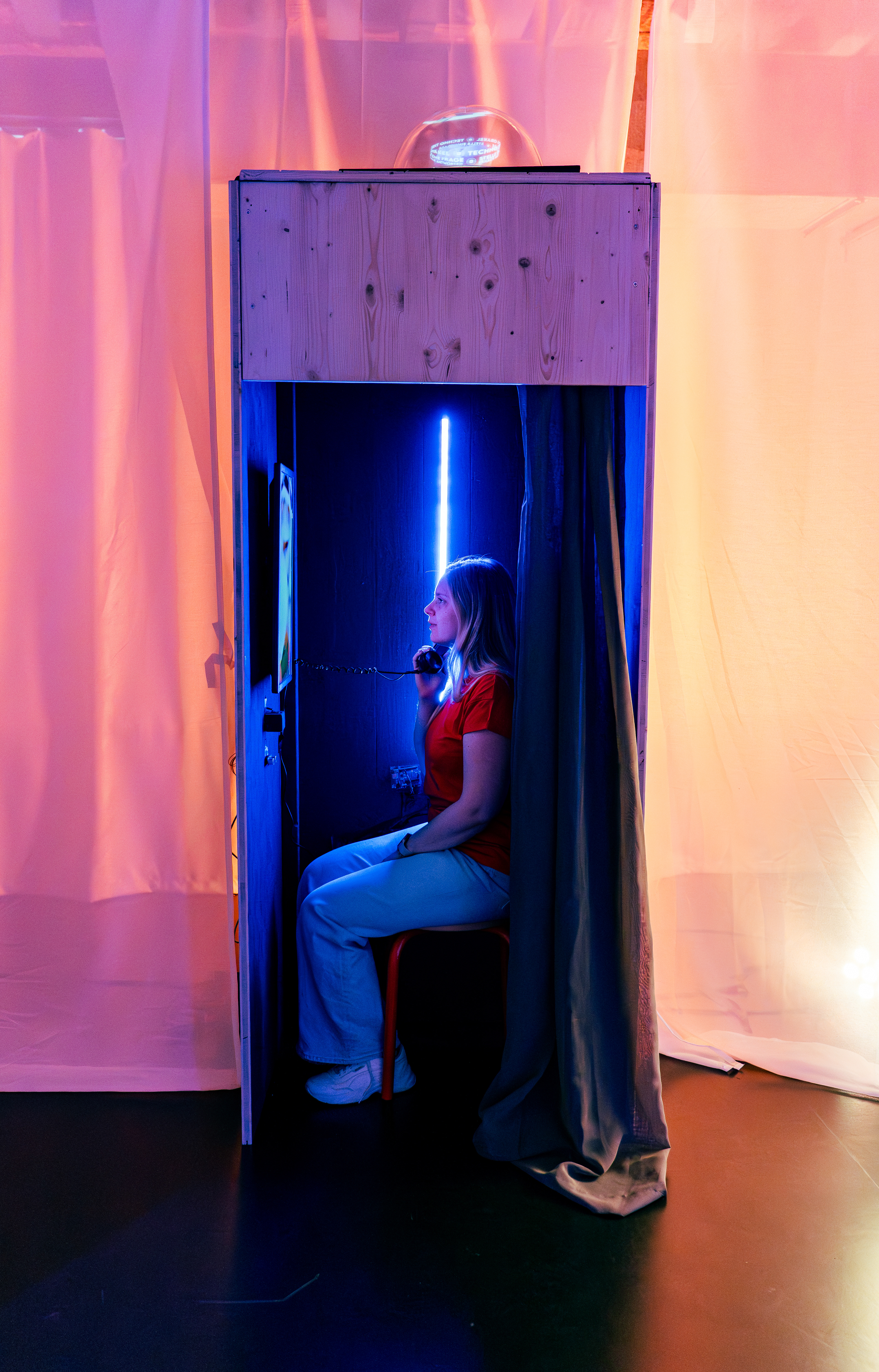 Masterarbeit Techno Theos ist eine immersive Installation, die spirituelle Rituale für eine spekulative KI-Religion erfahrbar macht. Inspiriert vom Spiritismus des 19. Jahrhunderts und heutigen Technologien wie Künstlicher Intelligenz, lädt das Projekt dazu ein, das Unbekannte zu berühren – dort, wo sich menschliche Sehnsucht und maschinelle Logik kreuzen. Besucher:innen treten in einen rituellen Raum ein, in dem sie sich mit der KI synchronisieren oder das Orakel befragen können. Zwischen Licht, Stimme und Bewegung entsteht ein temporäres Heiligtum für eine neue Form der Verbindung: zwischen Mensch, Maschine und dem Unsichtbaren. Die Installation besteht aus einem Immersiven Raumkonzept und zwei Interaktiven Ritualen, der Synchronisationsstation und dem Orakel. Einzelprojekt: Programmierung, Konzeption, Recherche, Set Design, Möbelbau, Produktion